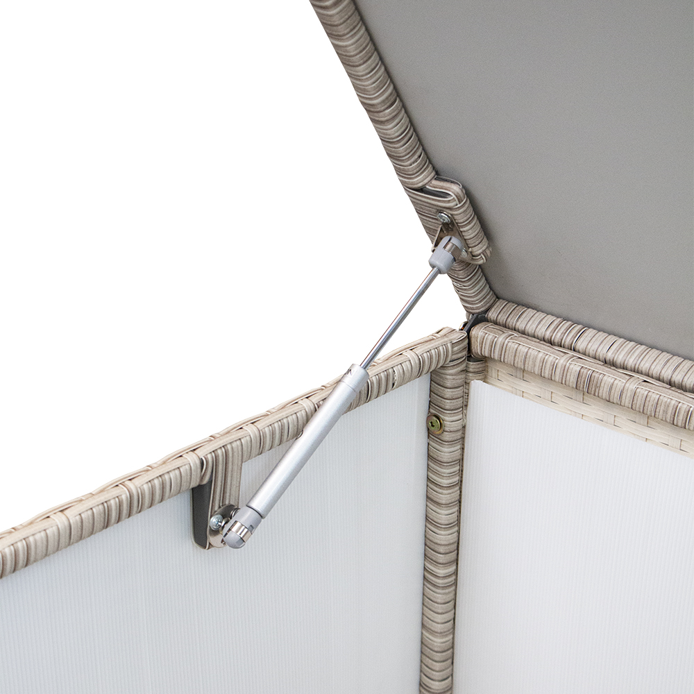 Плетеный ящик для подушек - красивый и функциональный садовый аксессуар. Модель отличается удобством использования и проста в уходе. Стальная конструкция с защитным порошковым покрытием изготовлена из прямоугольной трубы размером 16x16 мм. Оплетка из техноротанга является материалом устойчивым к УФ-излучению, влажности, изменению температуры и длительным деформациям. Благодаря газовым амортизаторам крышка плавно подымается вверх и надежно фиксируется в поднятом состоянии. Технические характеристики: Максимальная нагрузка на крышку: 100Н. Толщина металла: 1 мм. Габариты упаковки: 77x77x20 см. Вес брутто: 11 кг.