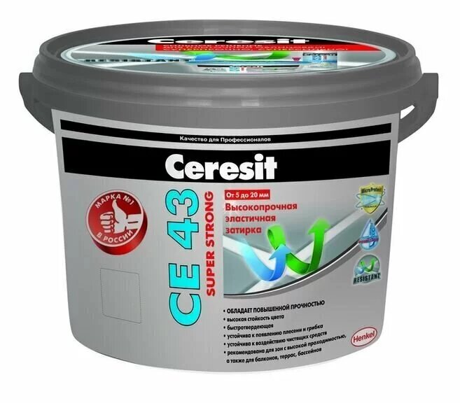 Затирка для швов Ceresit CE 43 Super Strong Карамель - высокопрочная эластичная водоотталкивающая затирка для широких швов от 5 до 40 мм. Предназначена для заполнения швов облицовок из керамической и клинкерной плитки, искусственного и природного камня на полах и стенах внутри и снаружи зданий при ширине шва от 5 до 40 мм. Применяется также для заполнения швов кладок из декоративного кирпича и камня. Благодаря высокой прочности эффективна на облицовках, подверженных повышенному износу: на балконах, террасах, входных группах, лестницах, коммерческих кухнях, гаражах и т.п. Благодаря водоотталкивающим свойствам (эффект «Aquastatic») и высокой стойкости к грибкам и плесени (формула «MicroProtect») эффективна на облицовках, эксплуатирующихся в условиях постоянной влажности. Преимущества затирки для плитки Ceresit CE 43 Super Strong: обладает противогрибковым эффектом (формула«MicroProtect»); водоотталкивающая (эффект Aquastatic); устойчива к большинству бытовых моющих и чистящих средств; эластичная, устойчива к деформациям; обладает высокой стойкостью цвета; водо- и морозостойкая; может применяться на полах с подогревом; пригодна для внутренних и наружных работ; экологически безопасна. Работы следует выполнять при температуре воздуха и основания от +5 до +30°C и относительной влажности воздуха не выше 80%. Повышенная влажность основания, разное количество воды затворения, неравномерное высыхание и слишком интенсивное заглаживание швов могут привести к появлению разнотона и снижению водоотталкивающих свойств затирки. Во избежание различия оттенков швов, на одной плоскости рекомендуется использовать затирку одной партии. Затирка приобретает заявленный цвет по истечении 24-48 часов в зависимости от условий окружающей среды после затирания швов, выполненного в соответствии с рекомендациями по применению. Оттенок цвета готовой затирки в шве может отличаться от цвета сухой смеси; обозначенного цвета на упаковке.